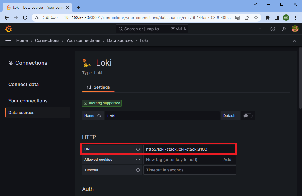 URL에 Loki의 주소를 입력한다. http://<SERVICE_NAME>.<NAMESPACE>:<PORT> 형태인데