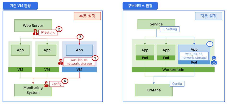 기존 VM 환경과 쿠버네티스 환경을 비교해보자.
