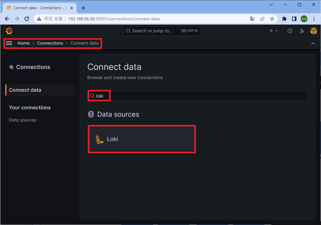 Home > Connections > Connect data 에 접속하여 검색창에 loki를 입력하여 선택한다.