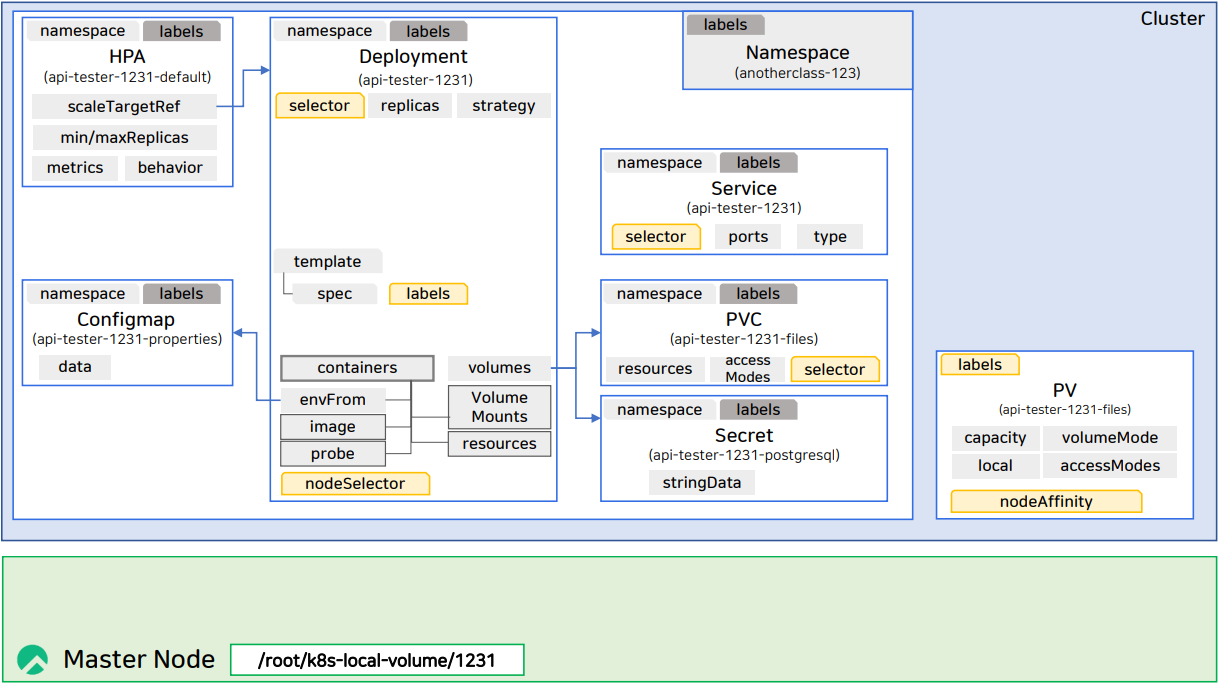 서로 연결되는 object들은 selector-labels 관계가 매칭되어있고,