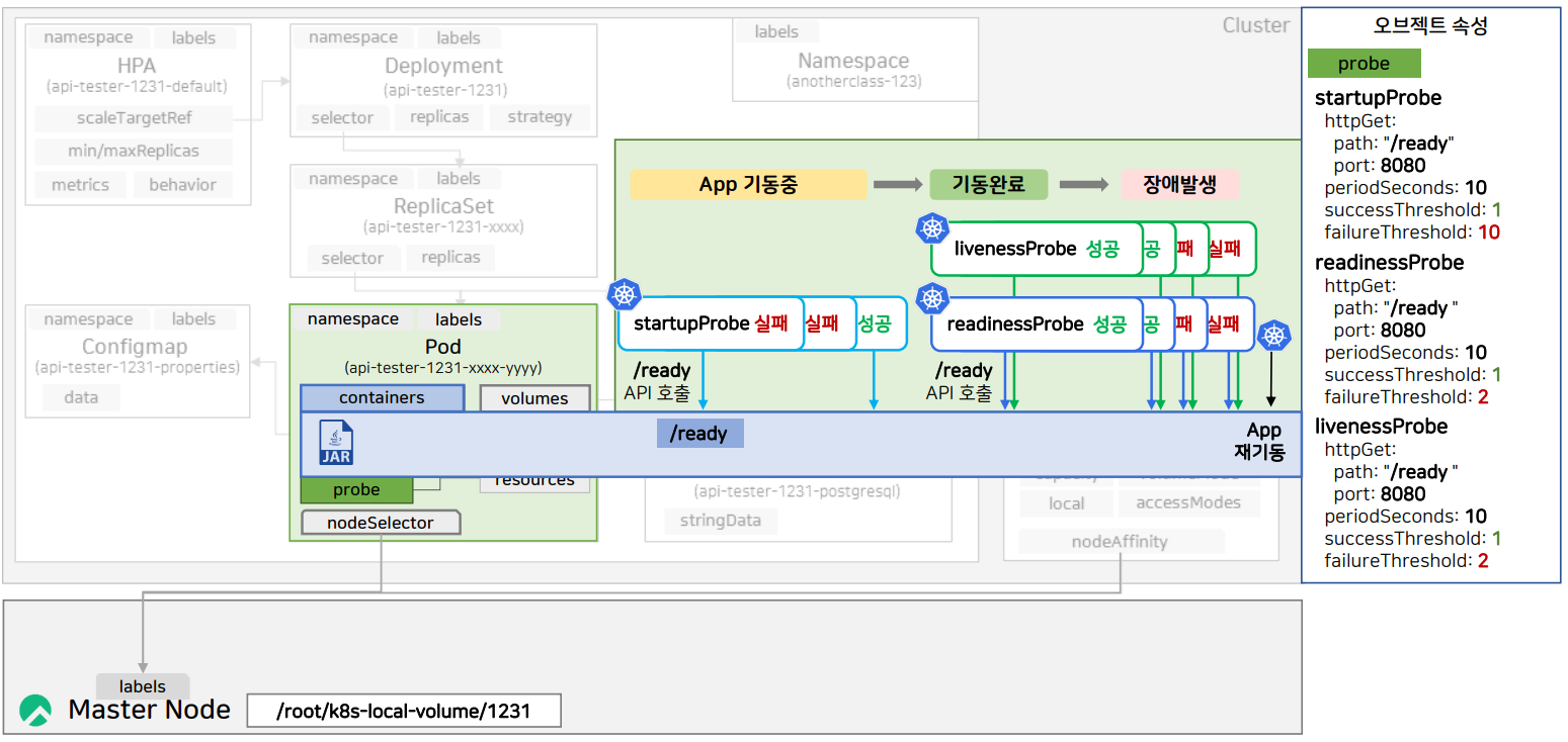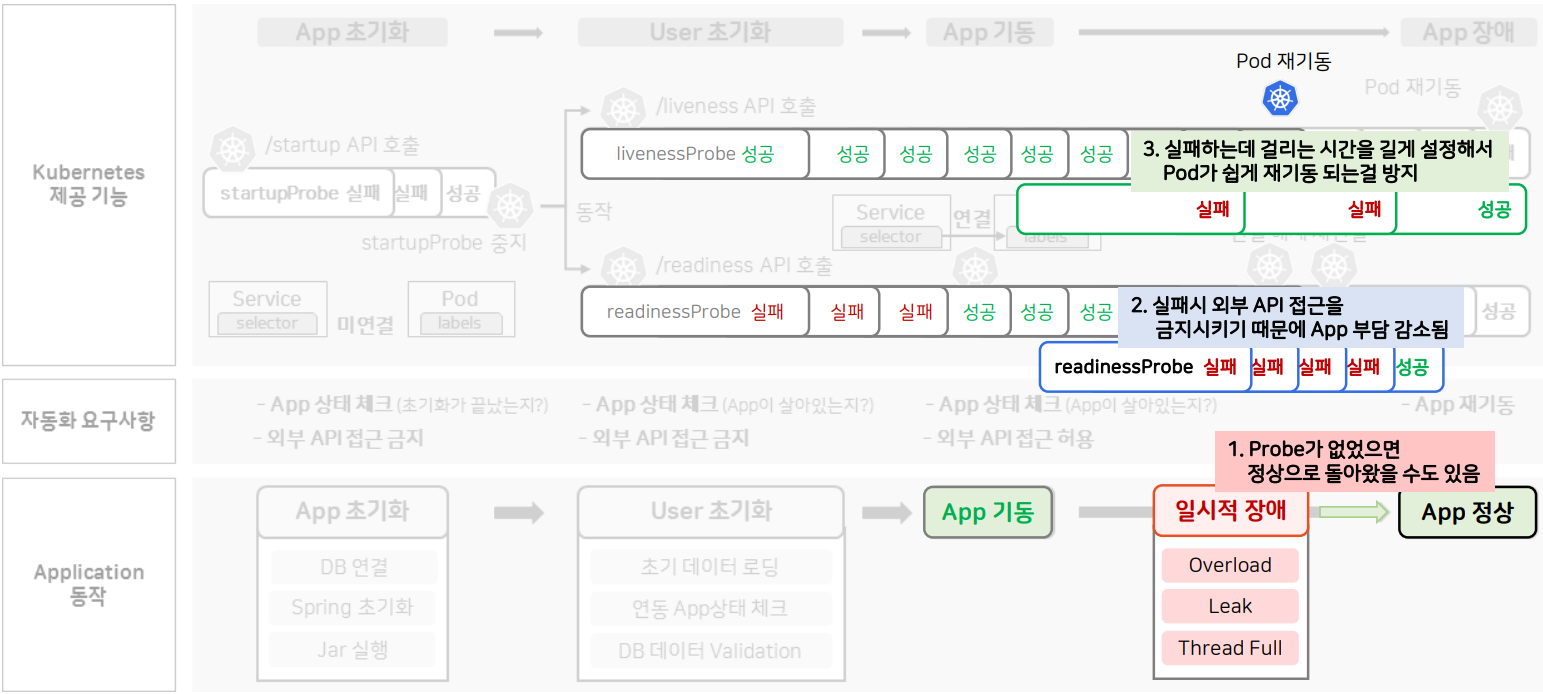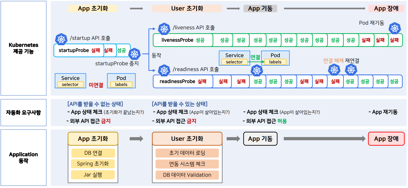 이 과정에서 livenessProbe와 readinessProbe가 실패하면 App이 재기동된다.
