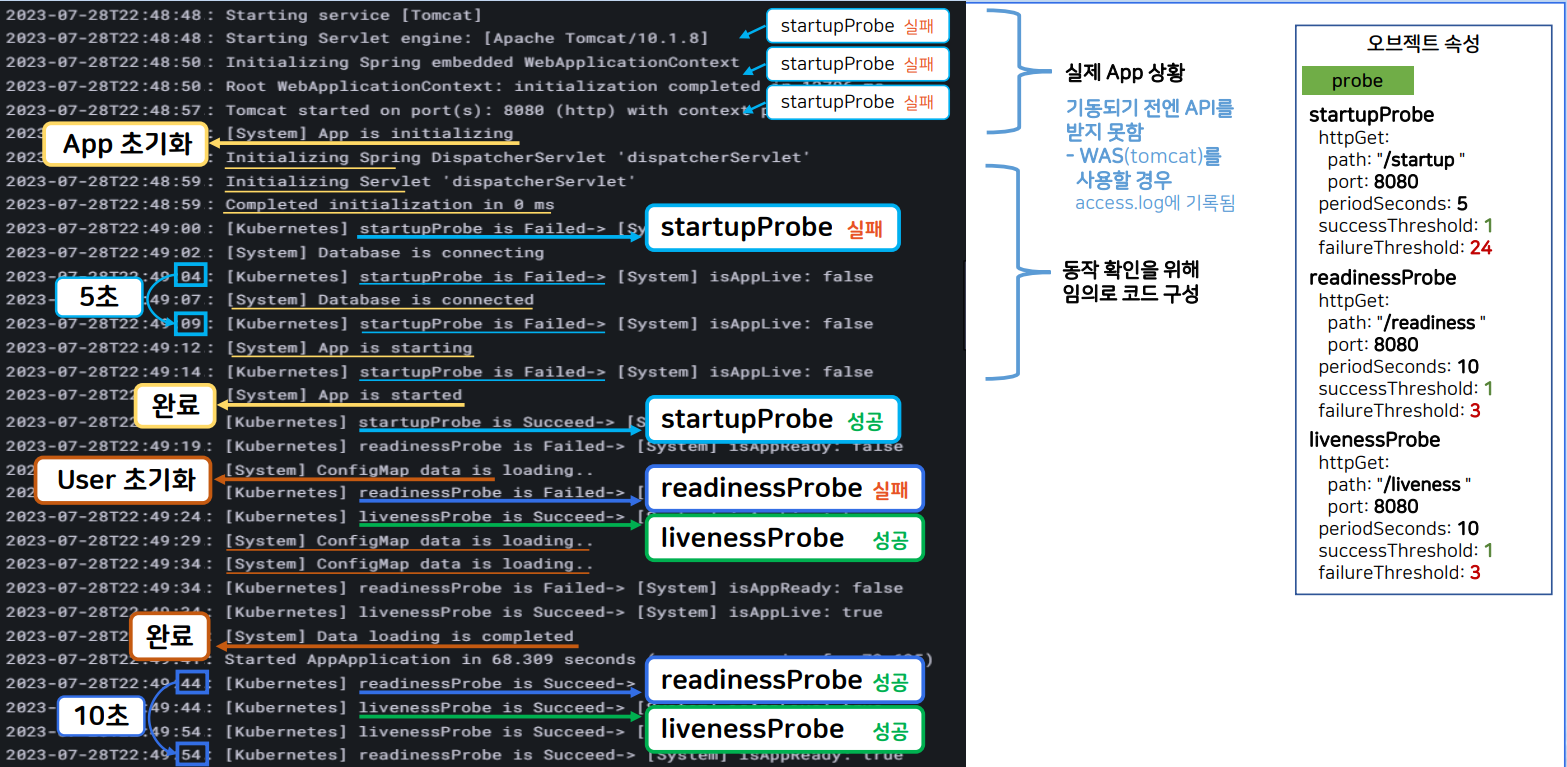 - 로그를 살펴보면 Spring App이 초기화 작업을 수행하는 동안에는 startupProbe가 실패한다.