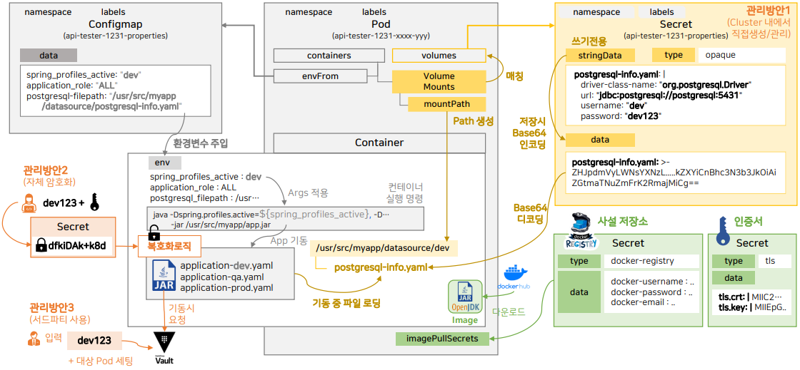 - Vault 같은 보안 관련 서드파티를 사용하여 관리한다. 관리자에 한해 아이디와 패스워드로 Vault에 접속하고 App에서 쓸 비밀번호를 입력한다. 그러면 pod가 기동하면서 vault에 비밀번호를 요청하는데, 관리자가 지정한 pod에만 비밀번호를 주도록 설정할 수 있다.
