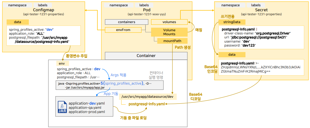 - 외부 환경을 App으로 주입시키기 위한 값: postgresql_filepath는 Secret 데이터로 연결할 파일의 경로이다. 해당 경로는 Pod의 mountPath에서 정하고, App에서 기동할 때 환경변수에서 DB의 정보를 확인하고 접속할 수 있다. 따라서 mountPath의 경로를 변경하고 싶을 때 앱을 다시 빌드하지 않고 Configmap data만 바꾸면 된다.