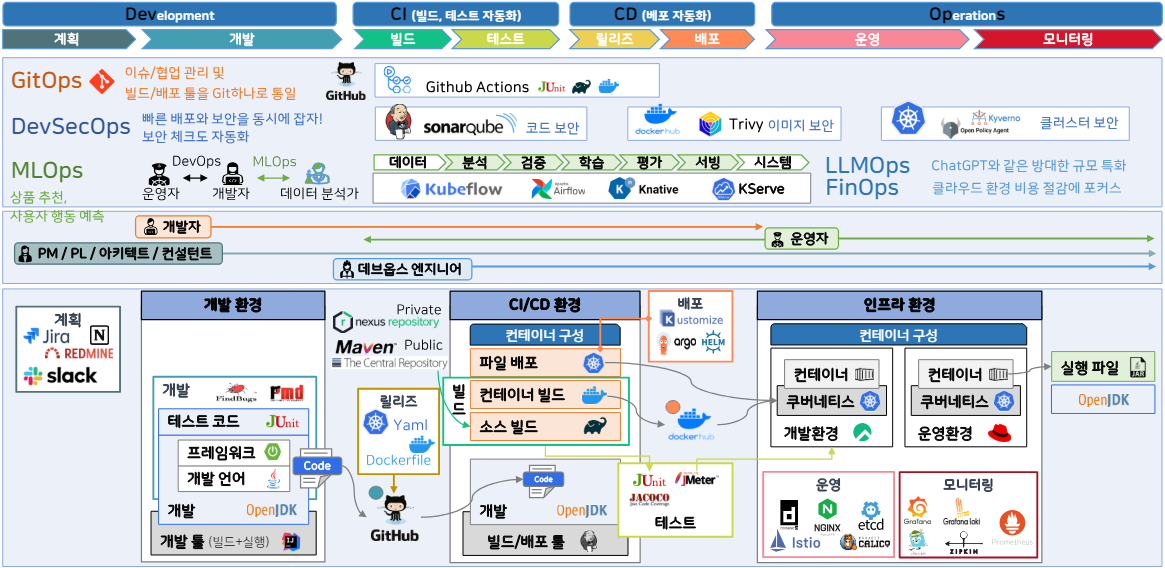 - 운영: 실제 운영환경을 보강하는 요소와 툴. 네트워크 트래픽 관리, 데이터베이스 역할을 하며 인프라 환경에 설치한다.