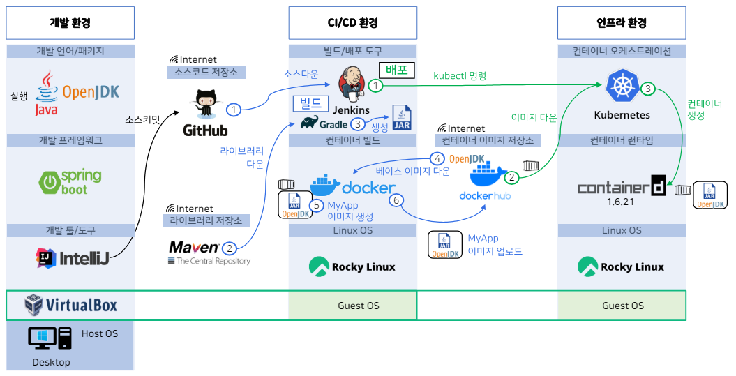 - IntelliJ로 개발한 소스코드를 GitHub로 커밋하면서 통합적으로 관리하다가 CI/CD 환경에서 빌드 버튼을 누르면 GitHub에서 최신 소스코드가 다운받아진다.