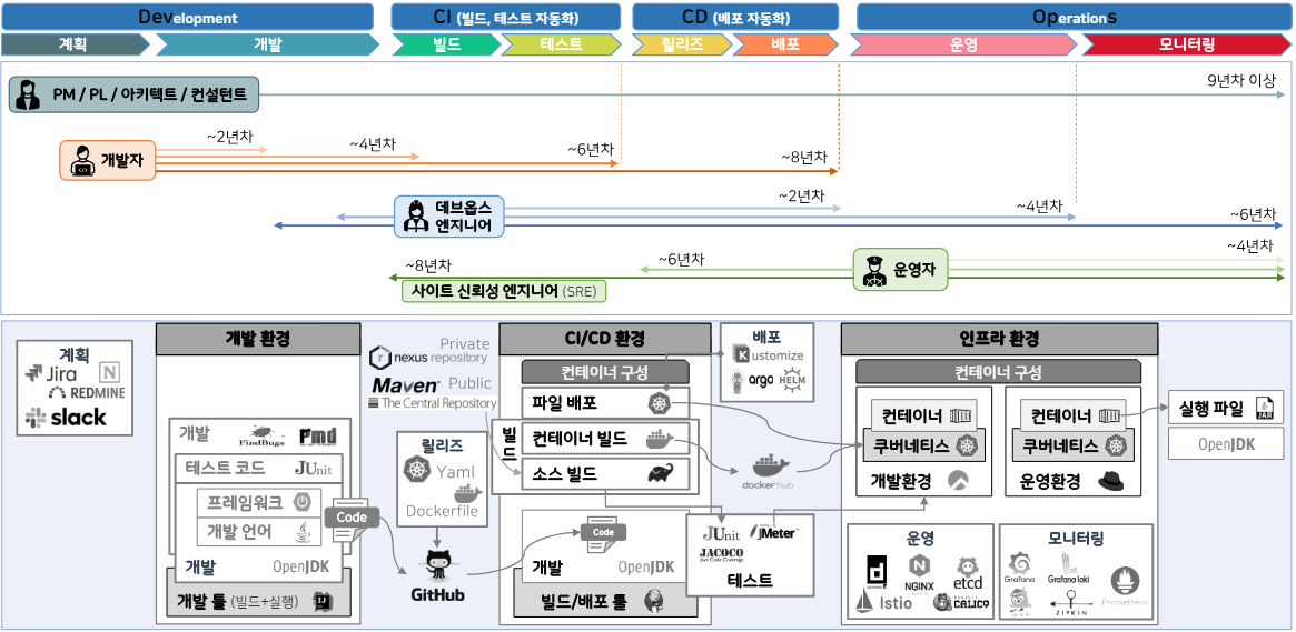 - ~8년차: 파이프라인의 시작인 빌드부터 운영 및 배포까지 주도적으로 구성을 업데이트할 수 있어야 함. 이러한 실력자를 사이트 신뢰성 엔지니어(SRE)라고 한다. CI/CD 까지 관여하는 운영자라고 보면 된다.