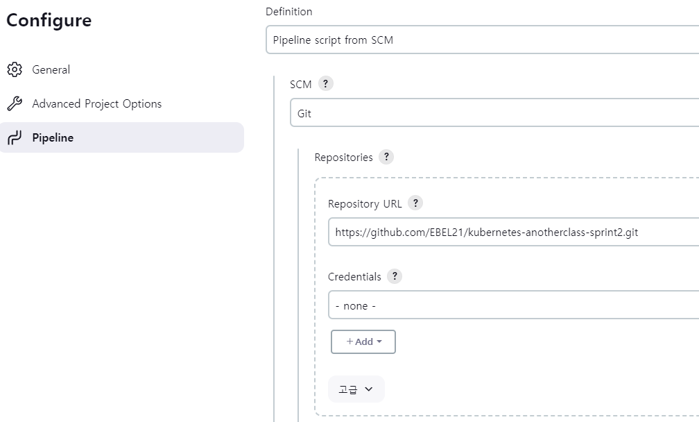 이후 구성(Configure) 메뉴에 들어가면 맨 아래에 pipeline script를 작성하는 곳이 존재한다.