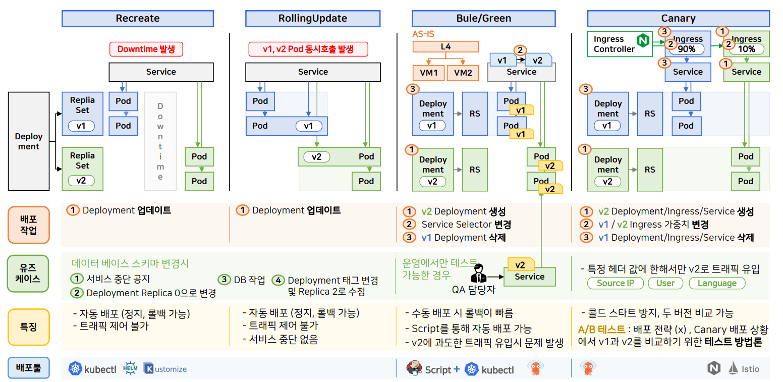 - 특징: 자동 배포, 트래픽 제어 불가, 서비스 중단 발생하지 않음. 다만 v1, v2 파드의 동시 호출이 발생한다.