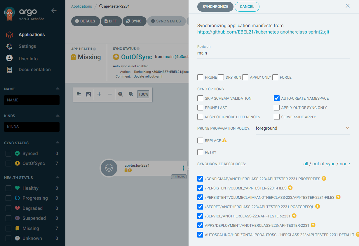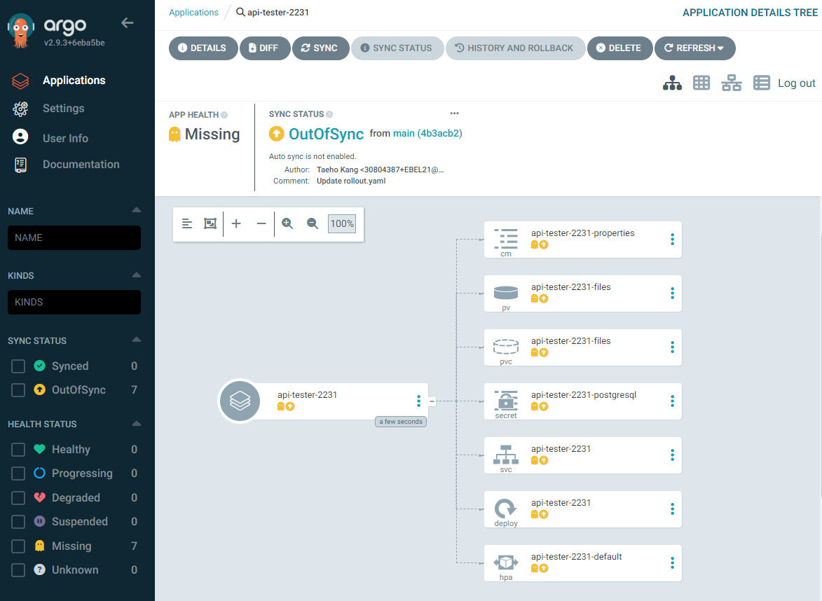 여기서 App Health가 Missing 상태이고, Sync Status 또한 OutOfSync 상태인것을 볼 수 있다.