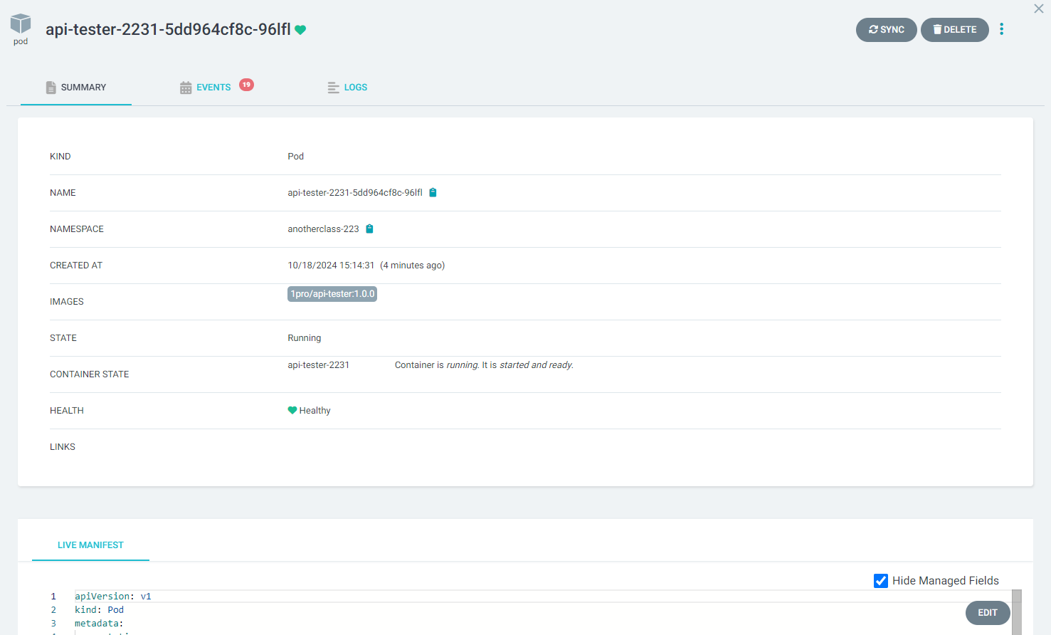 또한 로그 확인도 가능하며 아래 live manifest를 수정하여 kubectl edit과 같은 효과를 누릴 수 있다.