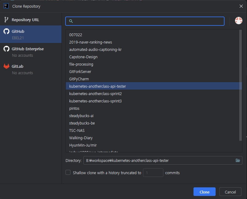 ▶ Git > [Clone...] 클릭 > GitHub username 선택 > Repository 선택 > [Clone] 클릭