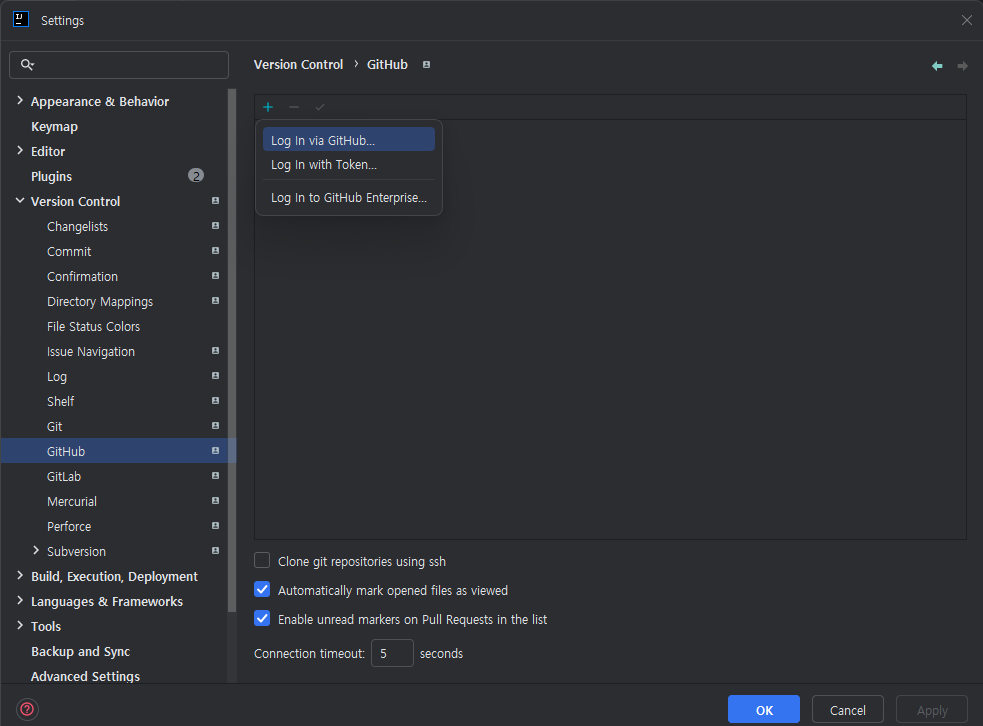 ▶ File > Settings > Version Control > Github > Add > Log In via GitHub...