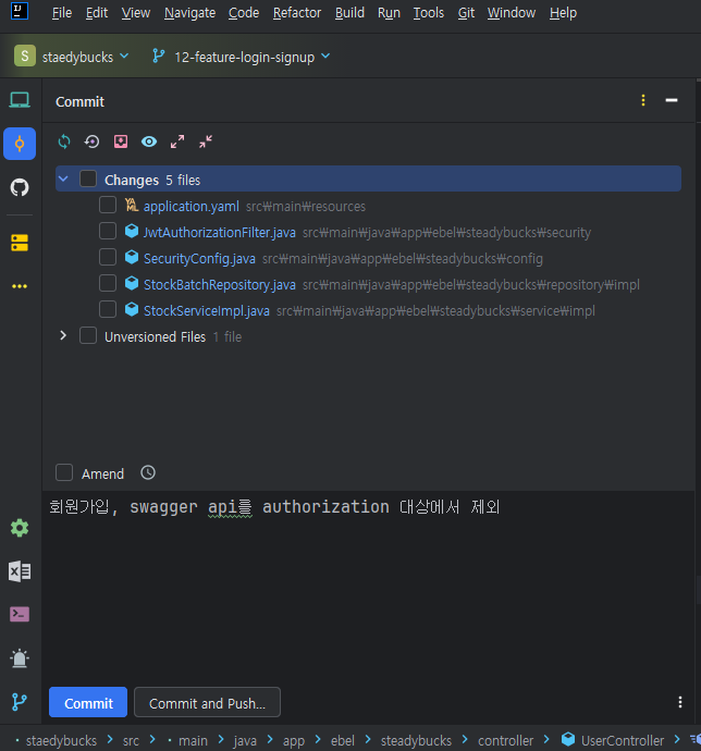 오른쪽 탭에서 Commit을 선택하고, 수정사항과 commit message를 확인 후 commit and push하면 된다.