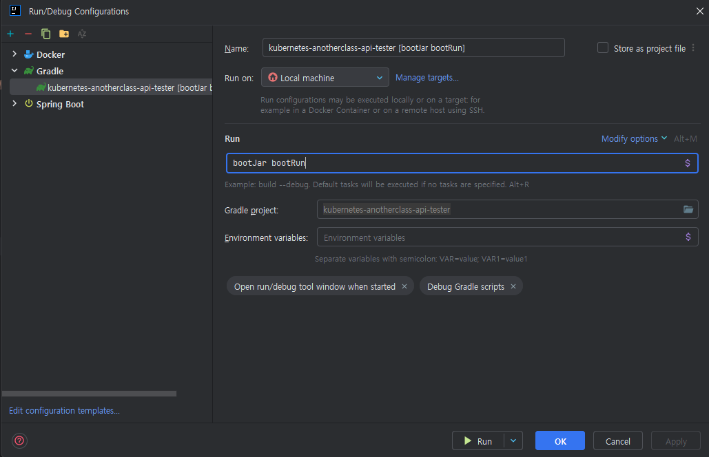 Run 명령어에 bootJar bootRun를 넣으면 실행 시 자동으로 build 하여 jar 파일을 생성하고, 해당 jar 파일을 실행한다.