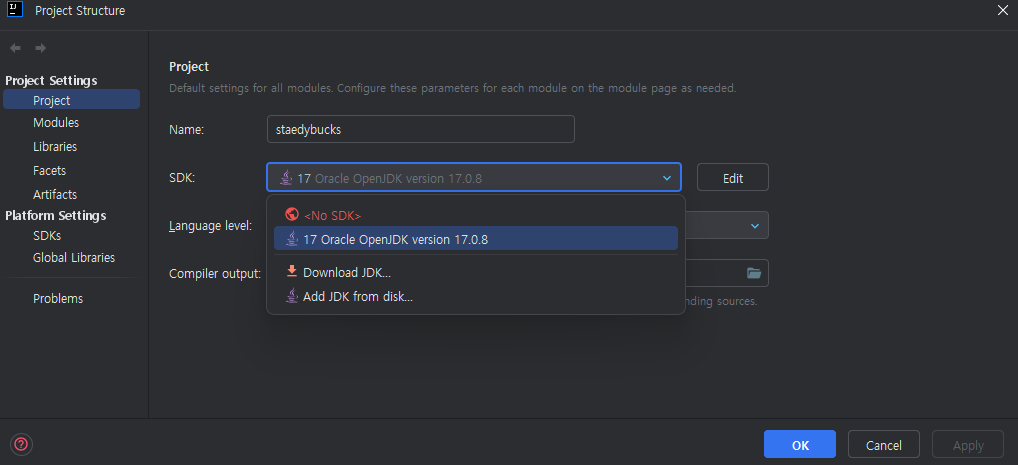 OpenJDK가 없다면 설치해주고, 프로젝트에서 사용할 JDK 버전 선택해준다.