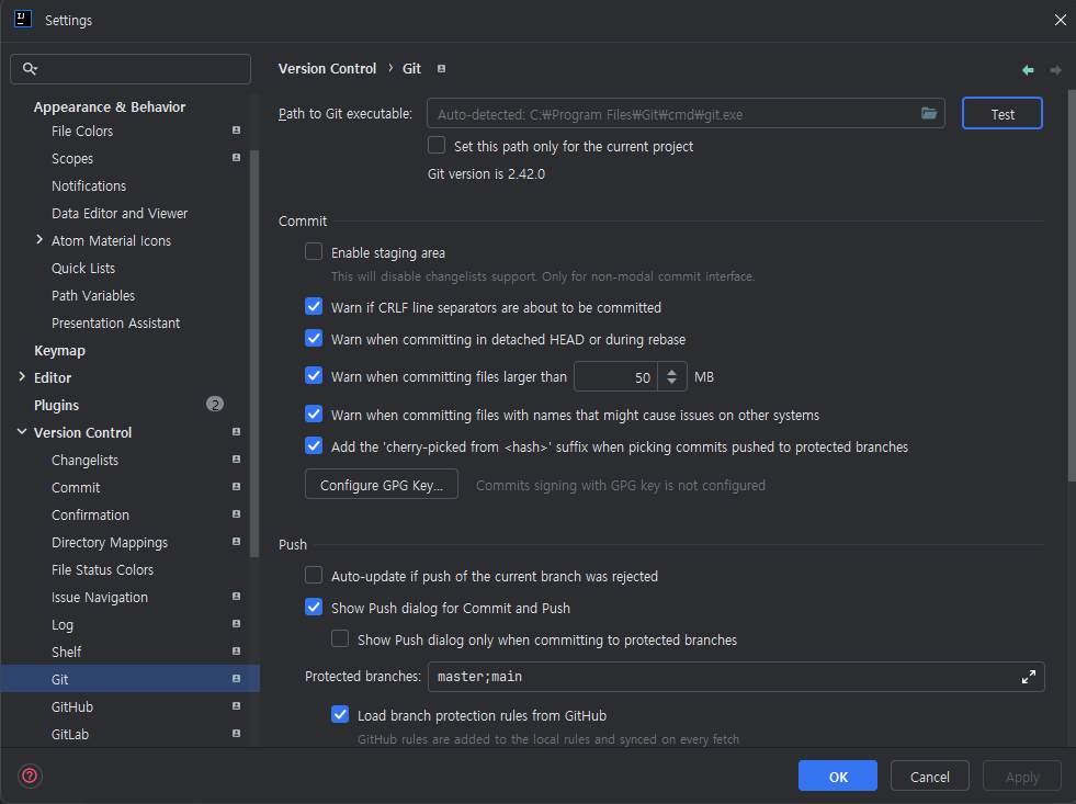 ▶ Win : File > Settings [ctrl+alt+s] > Version Control > Git > Test 버튼 클릭 후 > [Git version is 2.42.x] 확인