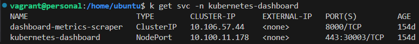 설치 후 k get svc -n kubernetes-dashboard를 입력하면